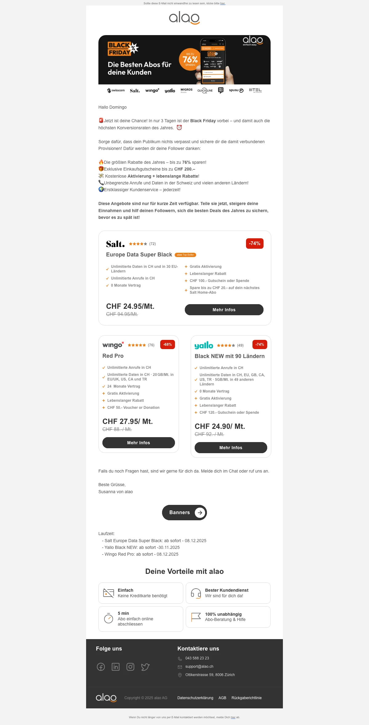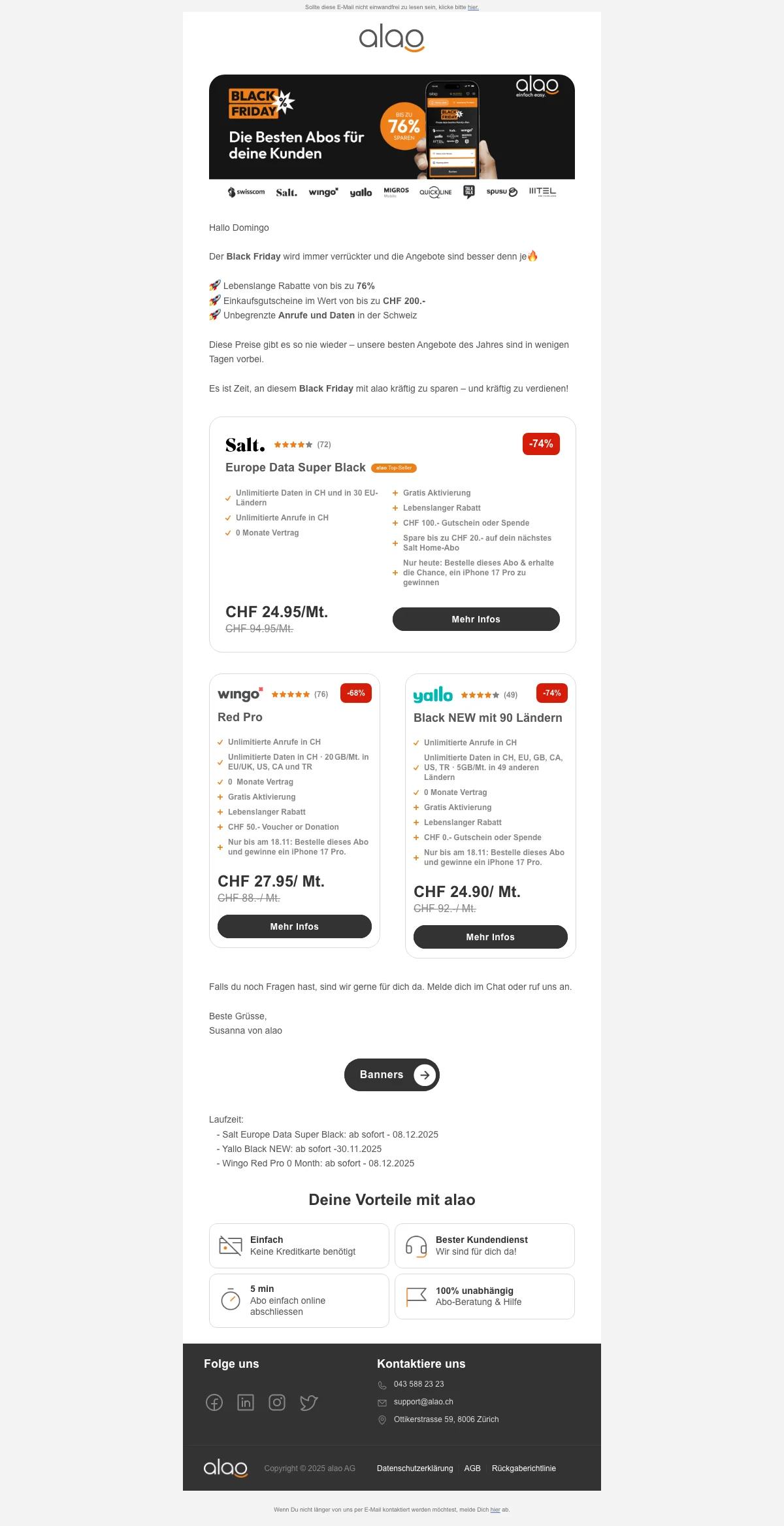 Das Unternehmen arbeitet mit den gängigsten Schweizer Telekommunikations-Unternehmen zusammen, um die bestmöglichen Angebote für dich buchbar zu machen. Jeder Mobilfunk-Anbieter hat seine eigenen Rabatte, Aktionen & Vorteile. alao erleichtert es dir, den Vertrag auszuwählen, der am besten zu deinen individuellen Bedürfnissen passt. Egal, ob du nach der schnellsten Geschwindigkeit oder dem höchsten Datenvolumen suchst, sie helfen dir dabei, das bestmögliche Angebot und den günstigsten Deal zu finden. alao macht dir deinem Handy Abo Vergleich super einfach und komfortabel. Also auf was wartest du noch? Sicher dir deinen neuen Kommunikationstarif noch heute!