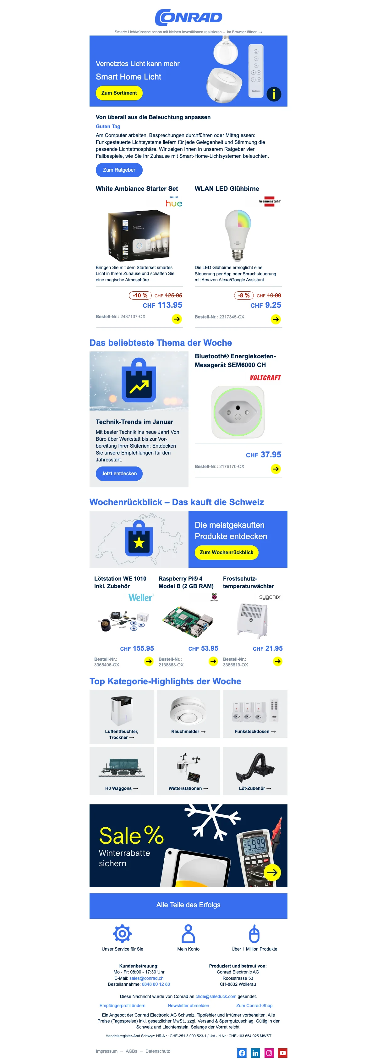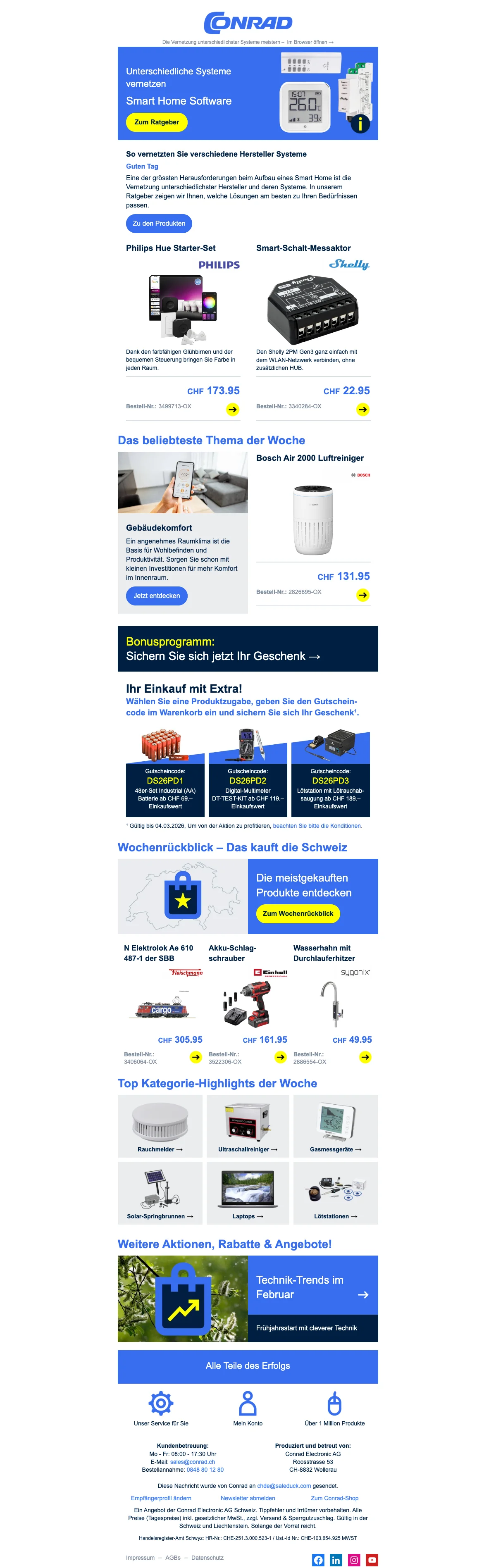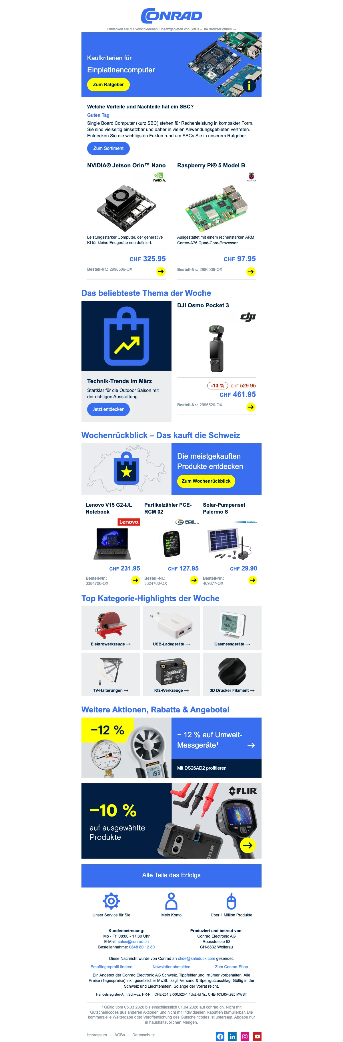 Conrad.ch bietet seinen Kunden stets gute Preise und viele Sonderaktionen und Rabatte. Nutze auch die Gutscheincodes von Saleduck.ch, um immer die besten Rabatte und Angebote zu erhalten. So einfach kannst du jede Menge Geld beim Elektronik-Einkauf sparen.