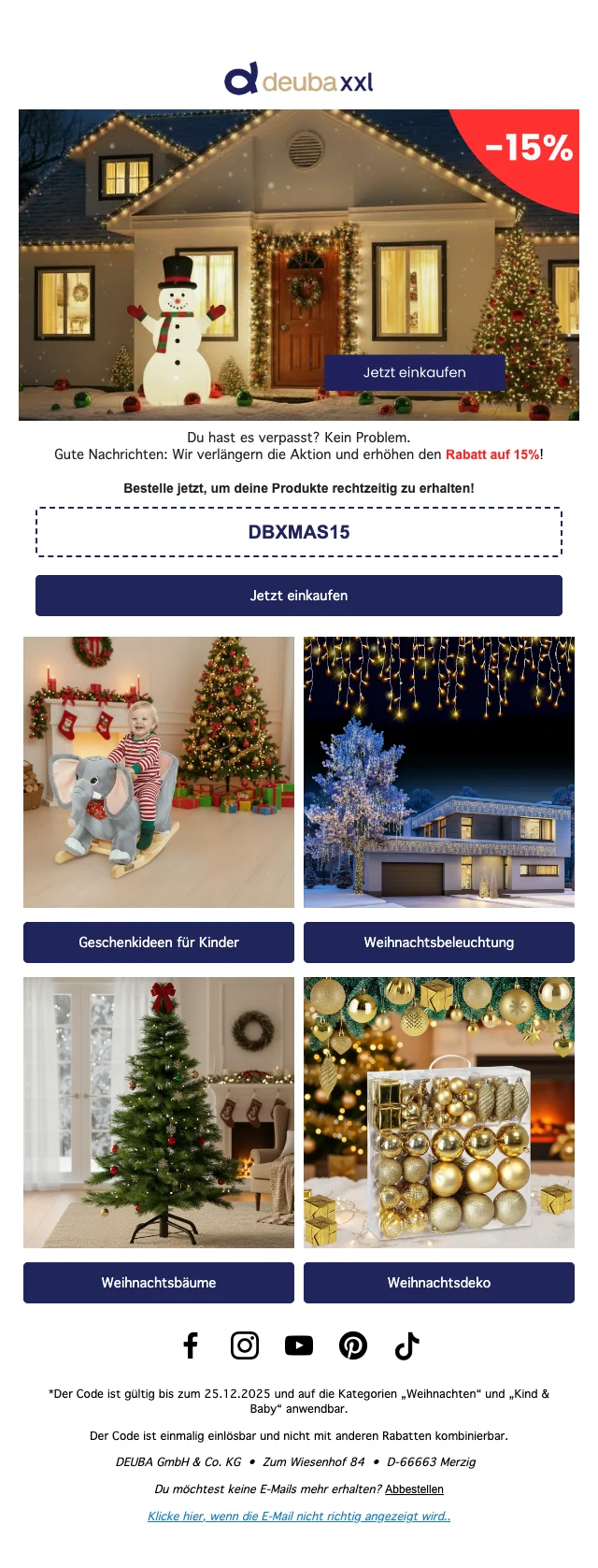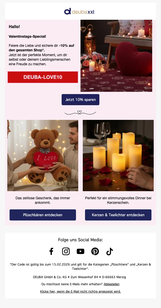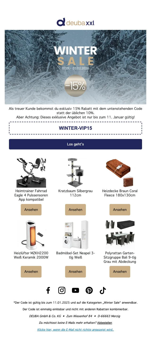 Es ist bereits DeubaXXL Monate her, dass 3 Rabattcodes hatte. Wir überwachen den Shop aktiv und senden dir eine Benachrichtigung, sobald neue Codes verfügbar sind. Hast du selbst einen gefunden? Lass es uns wissen!
