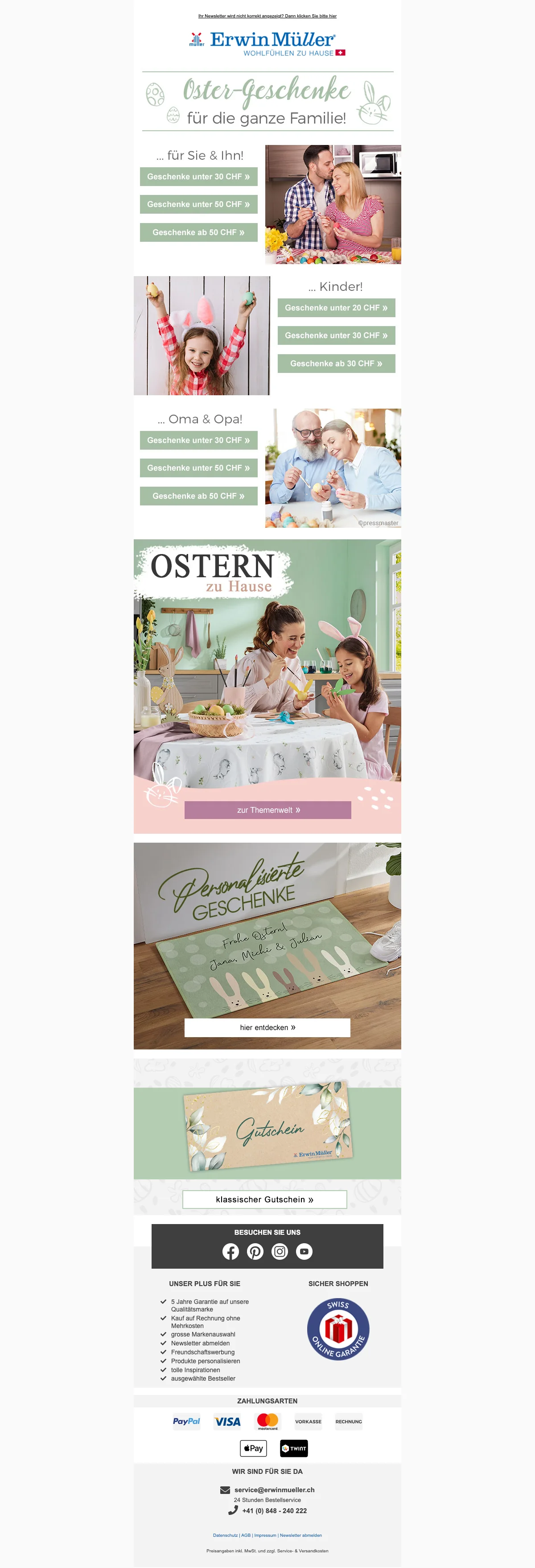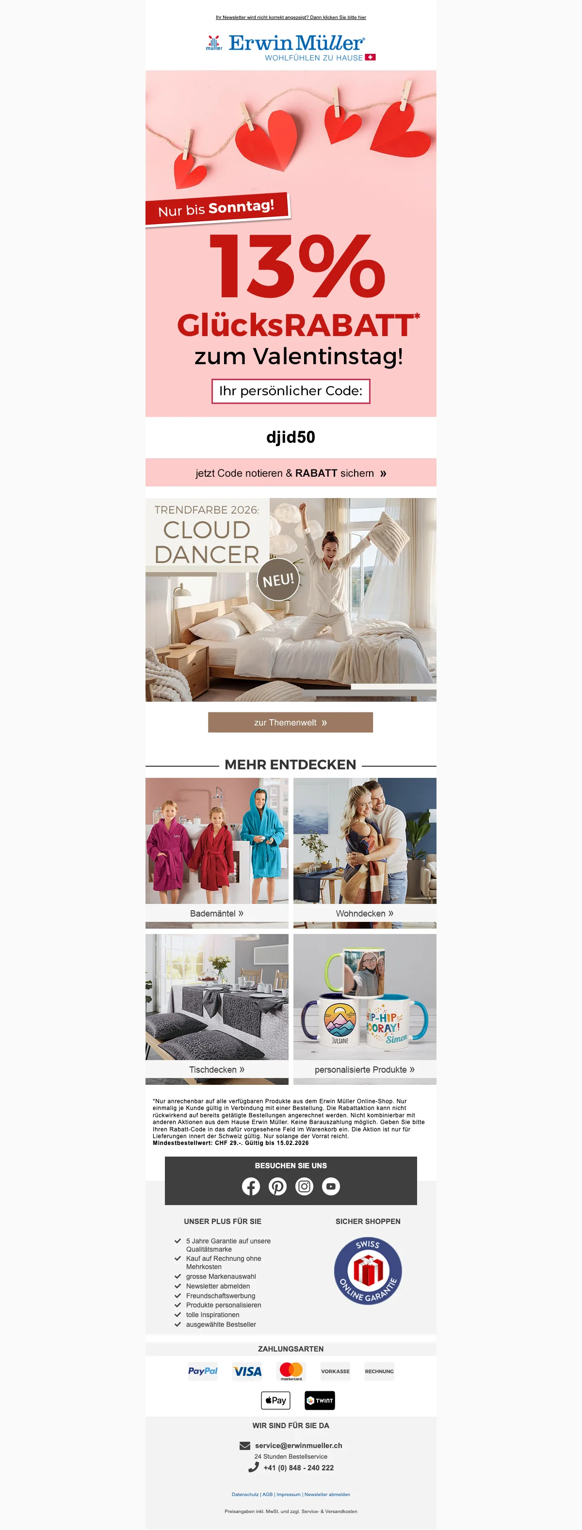 Du hast im Erwin Müller Bettwäsche Sale ordentlich zugeschlagen - dein Warenkorb ist voll! Im Angebot hast du dich bereits mit der angegebenen Lieferfrist vertraut gemacht. Im Warenkorb unten links siehst du nun ein Feld, wo du einen Erwin Müller Gutscheincode eintragen kannst. Diesen bekommst du in der Regel bei uns auf saleduck.ch. Kopiere ihn dir von uns, füge ihn an dieser Stelle in das Feld ein und genieße deinen extra Rabatt! Yeah! Als Zahlungsmethoden stehen dir Sofortüberweisung, PayPal, Kreditkarte, Vorauskasse und auf Rechnung zur Verfügung. Beim Erwin Müller Online Shop kannst du im Übrigen auch telefonisch, per Fax oder aber auch per E-Mail bestellen. Die Versandkosten betragen pauschal CHF 6.95 und dabei bleibt es auch, selbst wenn du Teillieferungen bekommen solltest. Du genießt bei Erwin Müller ein 14-tägiges Rückgaberecht (davon ausgenommene Artikel siehe Webseite). Die Retoure erfolgt auf deine Kosten.