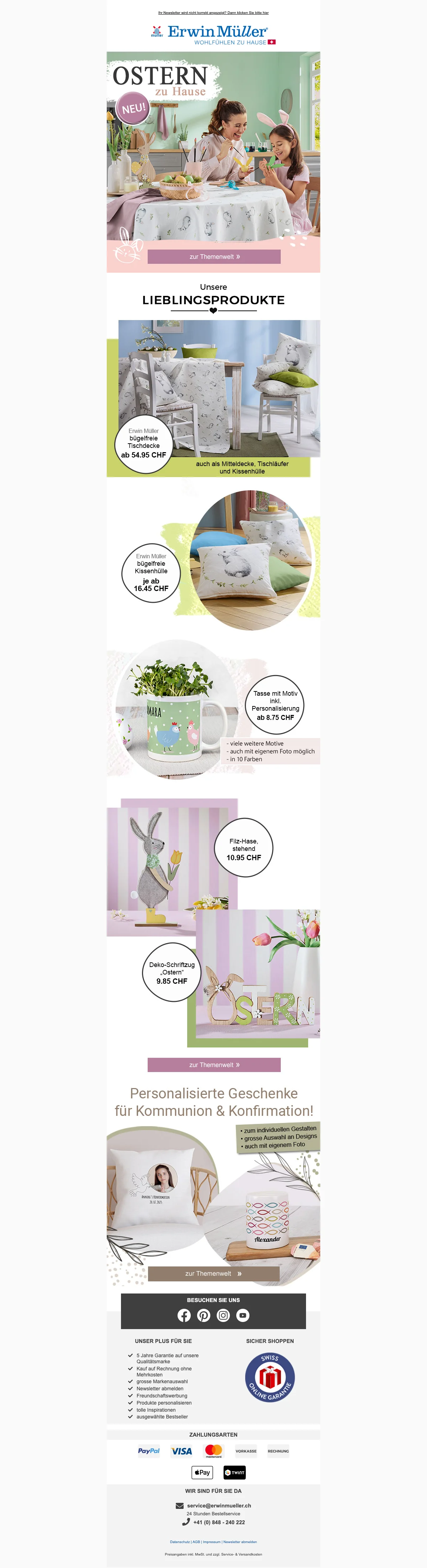 Auf der Webseite gibt es 4 Hauptkategorien: Zu Hause, Tisch & Küche, Baby & Kind, Manutextur. Unter "Zu Hause" findest du Unterkategorien, wie Schlafen, Bad, Wohnen, Erwin-Müller Welten, Sale usw.. Hier gibt es alles, was du für (d)ein gemütliches Zuhause brauchst, z.B. Handtücher, Duschtücher, Duschmatten, Tischdecken, Kissen, Baby- und Kinderdecken, Bettgarnituren, Kissenbezüge, Spannbettlaken, Tagesdecken, Hussen und Überzüge u.v.m.. Unter "Tisch & Küche" findest du viele praktische Artikel, wie Besteck, Brettchen, Gläser, Kaffeeservice, Frühstückssets, Tassen, Teller, Servietten, Mitteldecken, Bräter, Pfannen, Töpfe, Backformen, Küchenmesser usw.. Gerne kannst du dich auch in den Themenwelten inspirieren lassen. Angesagt sind z.B. Topics wie Einhorn, Santorini, Black & White, Küstenfeeling, Erstausstattung, Landhaus, Pfiffige Sprüche u.v.m..