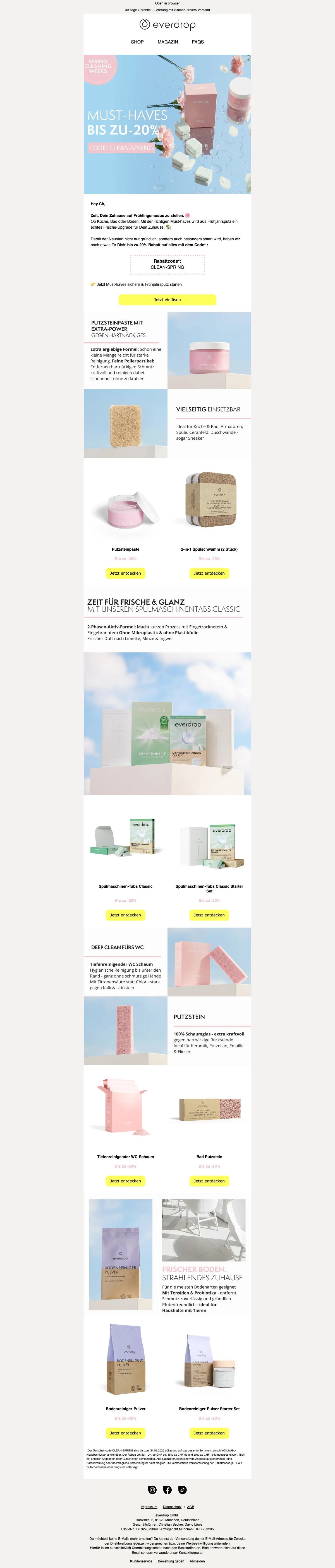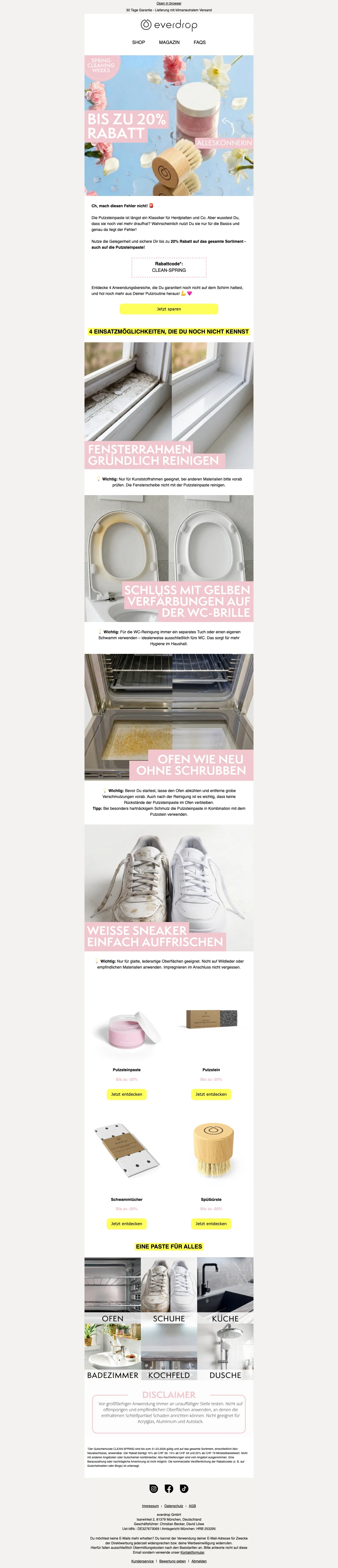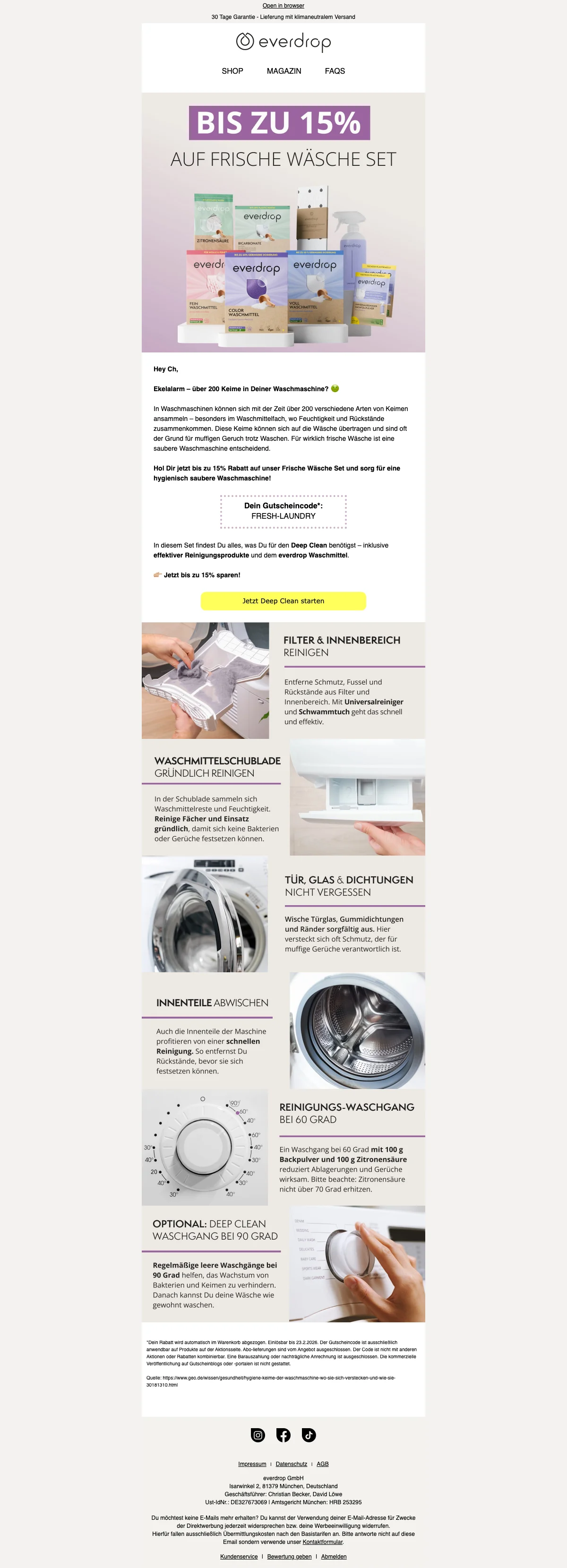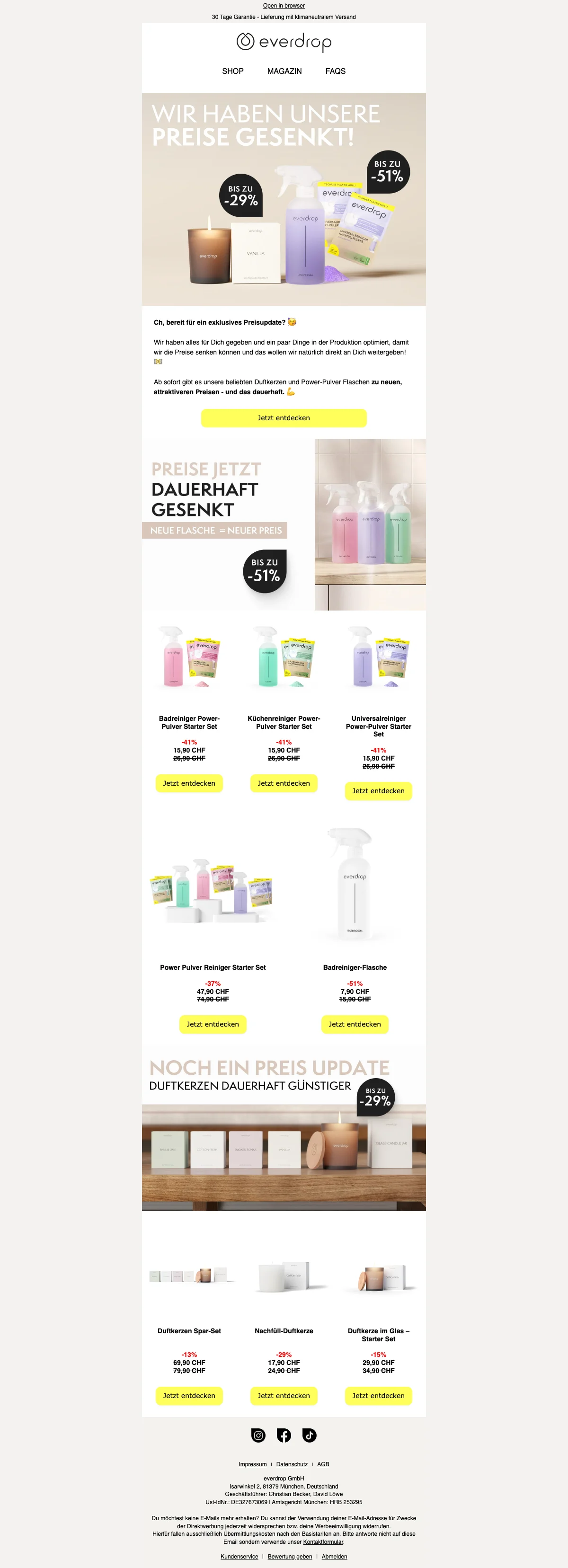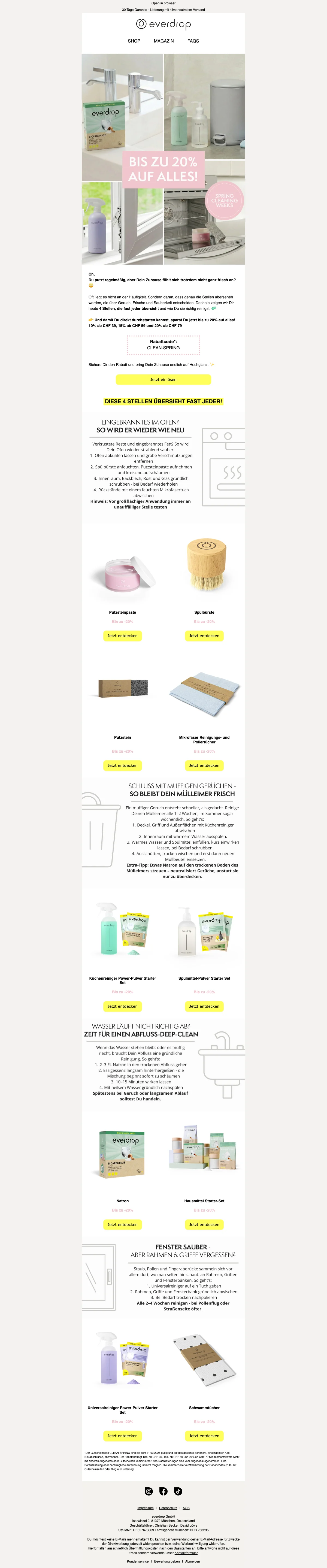 Nutze das Willkommensangebot und profitiere von 10 % Rabatt auf deine erste Bestellung. Diese Aktion gilt nur für Neukunden und ist eine großartige Möglichkeit, die nachhaltigen Produkte von everdrop auszuprobieren. Achte darauf, dass dein Mindestbestellwert CHF29 beträgt!
