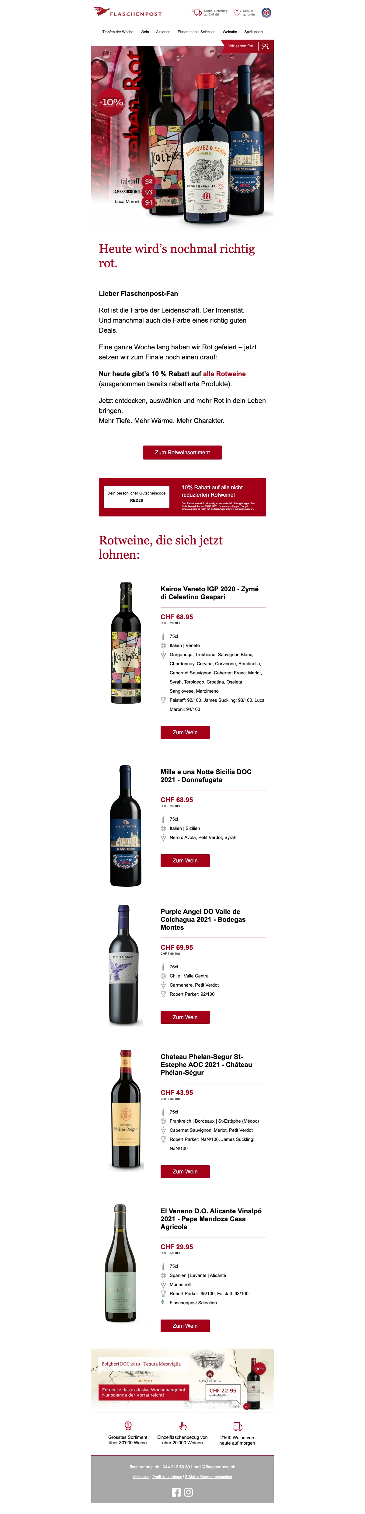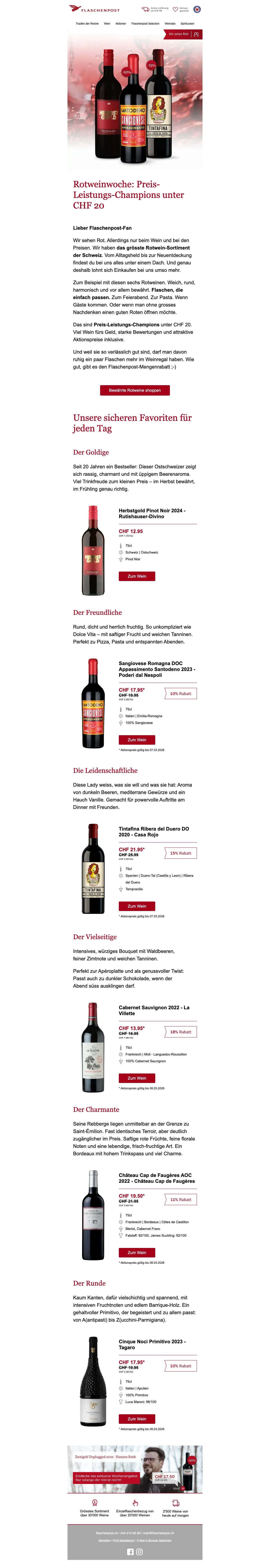 Beim größten Online Weinhändler Schweiz stehen dir 7 Hauptkategorien zum Surfen zur Verfügung: Sortiment, Aktionen, Entdecken, Weingeschenke, über uns, Services & Konditionen. Wenn du dir einen schönen Rotwein bestellen möchtest, kannst du im Suchbegriff-Feld den Namen des Weines, des Produzenten, der Traubensorte oder der Region eingeben. Funktioniert natürlich auch, wenn du einen Weißwein bestellen willst! Logisch! Ansonsten klickst du dich einfach ins Gesamtsortiment von diesem Weinshop online und selektierst dort gemäß der cleveren Suchkriterien aus. Diese lauten: Topseller, Aktionen, 24-Std. (bezieht sich auf die Lieferung), Prämiert, Bio, MustHaves. Neben Rot- und Weißweinen hat es auch Roséweine, Süßweine und prickelnde Champagner und Schaumweine im Angebot. Wein Online Handel mit fairen Preisen