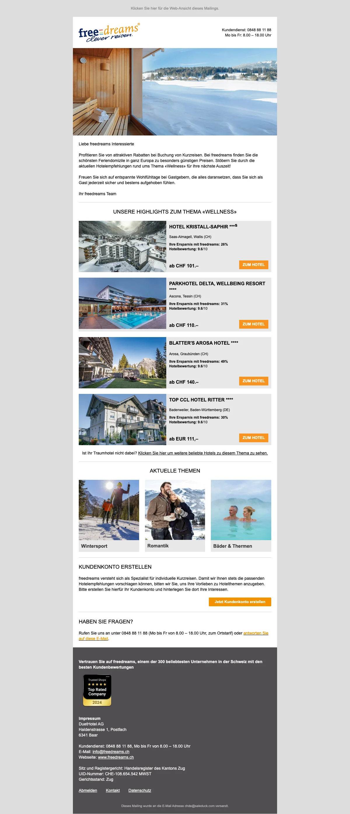 Freedreams.ch bietet dir über 2500 Hotels, überwiegend bestehend aus Drei- und Vier-Sterne-Hotels, in 18 europäischen Ländern zu unschlagbar günstigen Preisen an. Das Konzept ist dabei einzigartig, denn es basiert auf der Tatsache, dass Hotels unterschiedlich ausgelastet sind und wie man das clever ausnutzen kann, um Geld zu sparen. Auf diese Art und Weise erhältst du Angebote zu äußerst günstigen Konditionen und gleichzeitig ein Qualitätsversprechen, denn die Qualität wird regelmäßig kontrolliert und die Partnerhotels unterliegen strengen Auswahlkriterien.