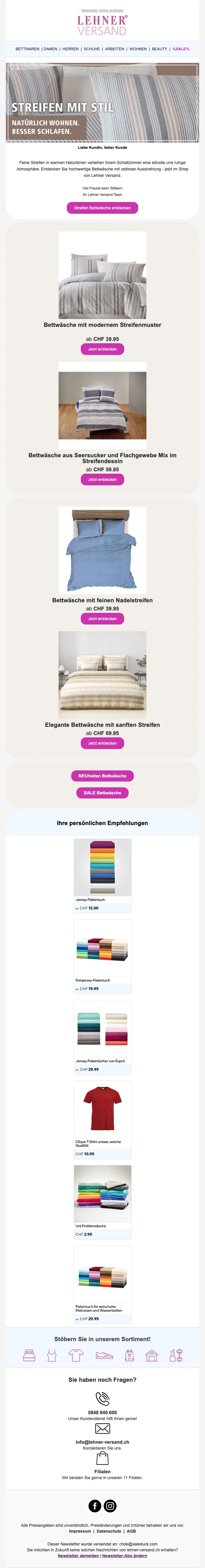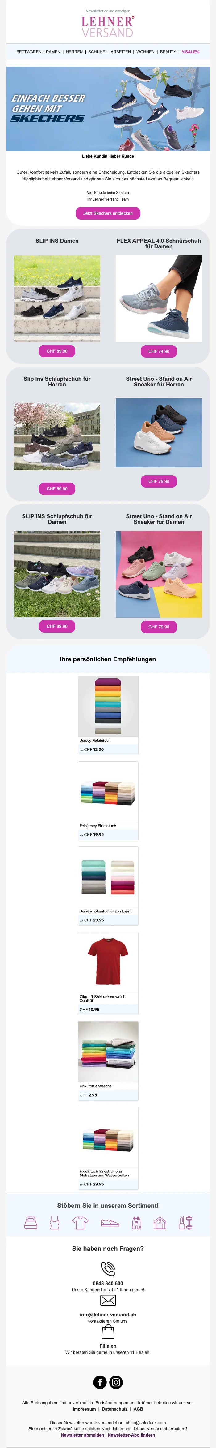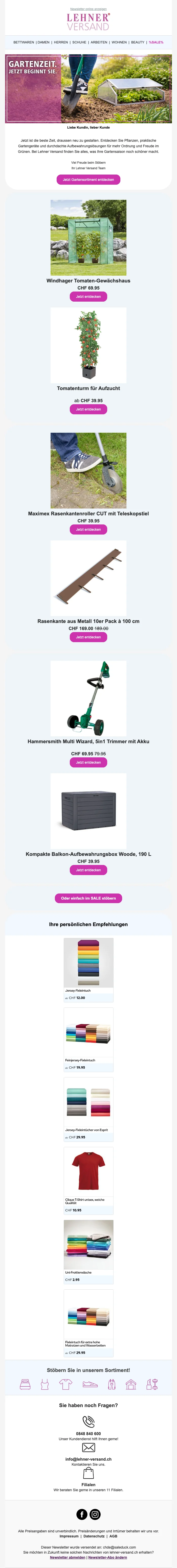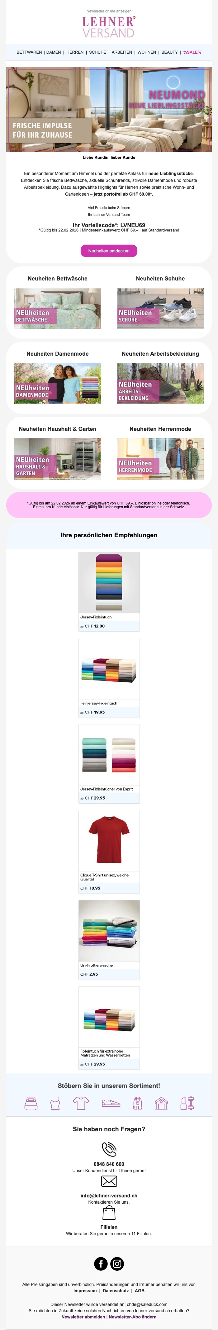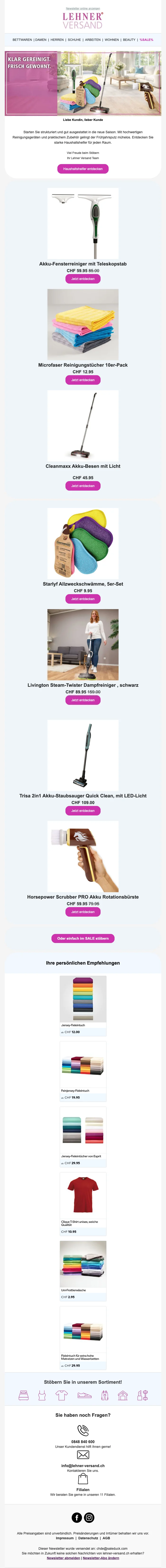 Bist du auf der Suche nach einem Onlineshop in der Schweiz, der dir so gut wie alles verkauft, sodass du nicht mehr in verschiedenen Shops suchen musst? Dann ist Lehner Versand genau die richtige Webseite für dich. Das Schweizer Versandhaus Lehner bietet tolle Artikel zu guten Preisen aus den verschiedensten Kategorien an. Hier findest du alles was rund um Mode und was du Zuhause brauchen kannst. Ob Bettwaren, Mode, Schuhe, Haushalt- oder Garten-Artikel, Fitness-, Beauty- und Pflegeartikel, hier ist für jeden das Richtige dabei. Schau dir am besten einfach mal das breite Angebot unter www.lehner-versand.ch an und finde die passenden Produkte für deine Bedürfnisse.