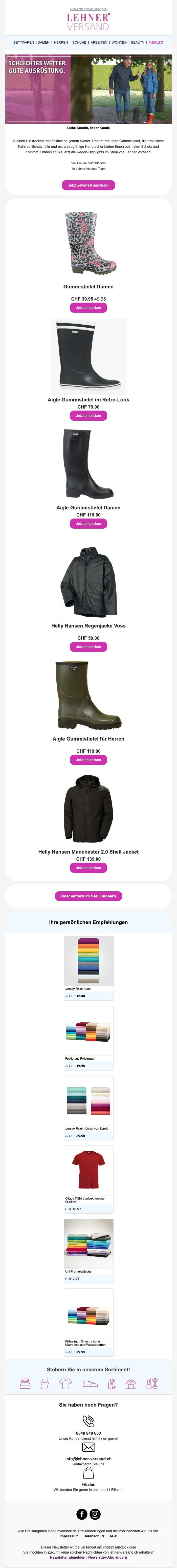Im Lehner Onlineshop kommt der Kundenservice nicht zu kurz! Du hast ein 10 Tage Rückgaberecht, auf Wunsch Express Versand und schnelle Lieferzeiten. Die Versandkosten vom Lehner Onlineshop betragen für Standard-Versand CHF 6.95 und für Express-Versand CHF 20.-. Halte jedoch Ausschau nach unseren Angeboten, um dir kostenlosen Versand zu holen.