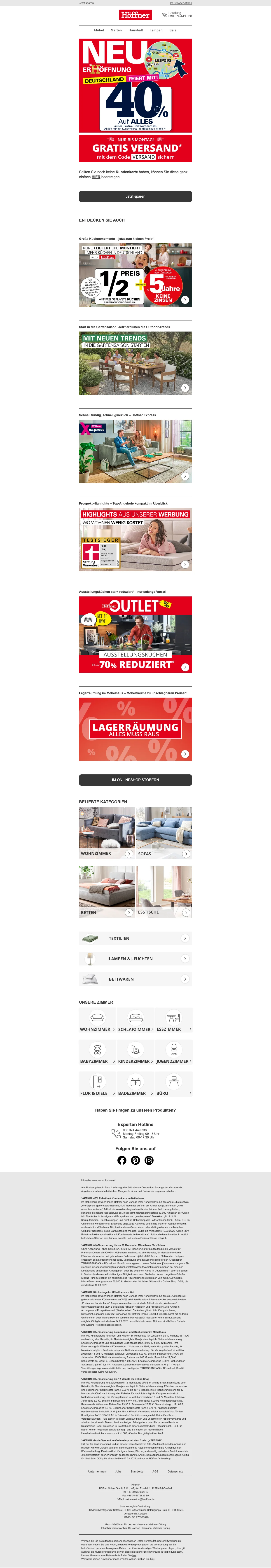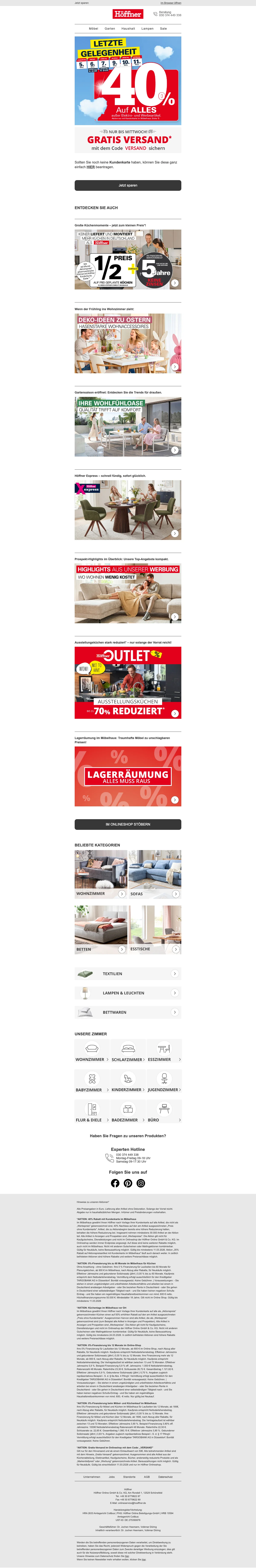 Verwandeln Sie Ihr Wohnzimmer mit stilvollen Möbeln von Höffner und sparen Sie 40% auf das gesamte Sortiment. Egal ob klassisch oder modern, hier ist für jeden Geschmack etwas dabei. Schlagen Sie jetzt zu und werten Sie Ihr Zuhause auf.