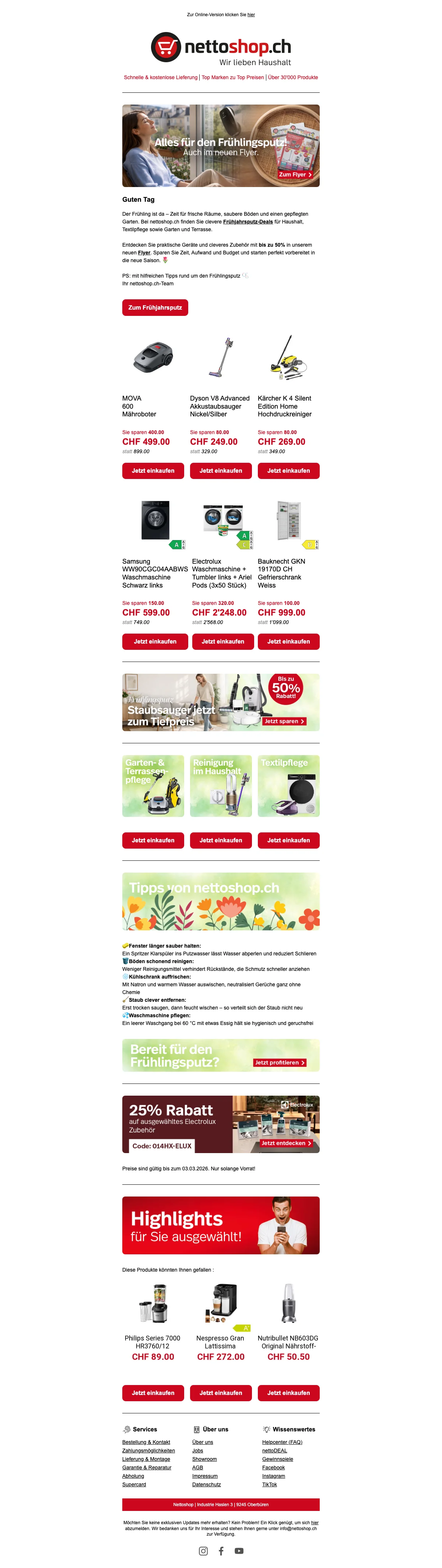 Hier gibts Haushalts-Grossgeräte, Kleingeräte und Artikel für Körperpflege und Gesundheit. Ob Waschmaschinen, Staubsauger, Kaffeemaschinen, Öfen, Kühlschränke, Küchengeräte, Gasgrills, Rasierer, Wellness, Wärme, Babycare oder Gesundheitsartikel, hier findest du alles, was du brauchst. Bestell dir jetzt Produkte von Top-Marken wie AEG, Bauknecht, Bosch, Braun, Dyson, iRobot, JURA Kaffeewelt, Kenwood, KitchenAid, Liebherr, Nespresso, Siemens, Sonos, Stadler Form, Venta oder V-Zug. Produkte ganz einfach von zu Hause aus bestellen und schon am nächsten Tag zugeliefert bekommen, so reibungslos funktioniert das hier. Weiters gibt es eine hilfreiche Info-Hotline, mit der dir bei Fragen stets kompetent weitergeholfen wird.