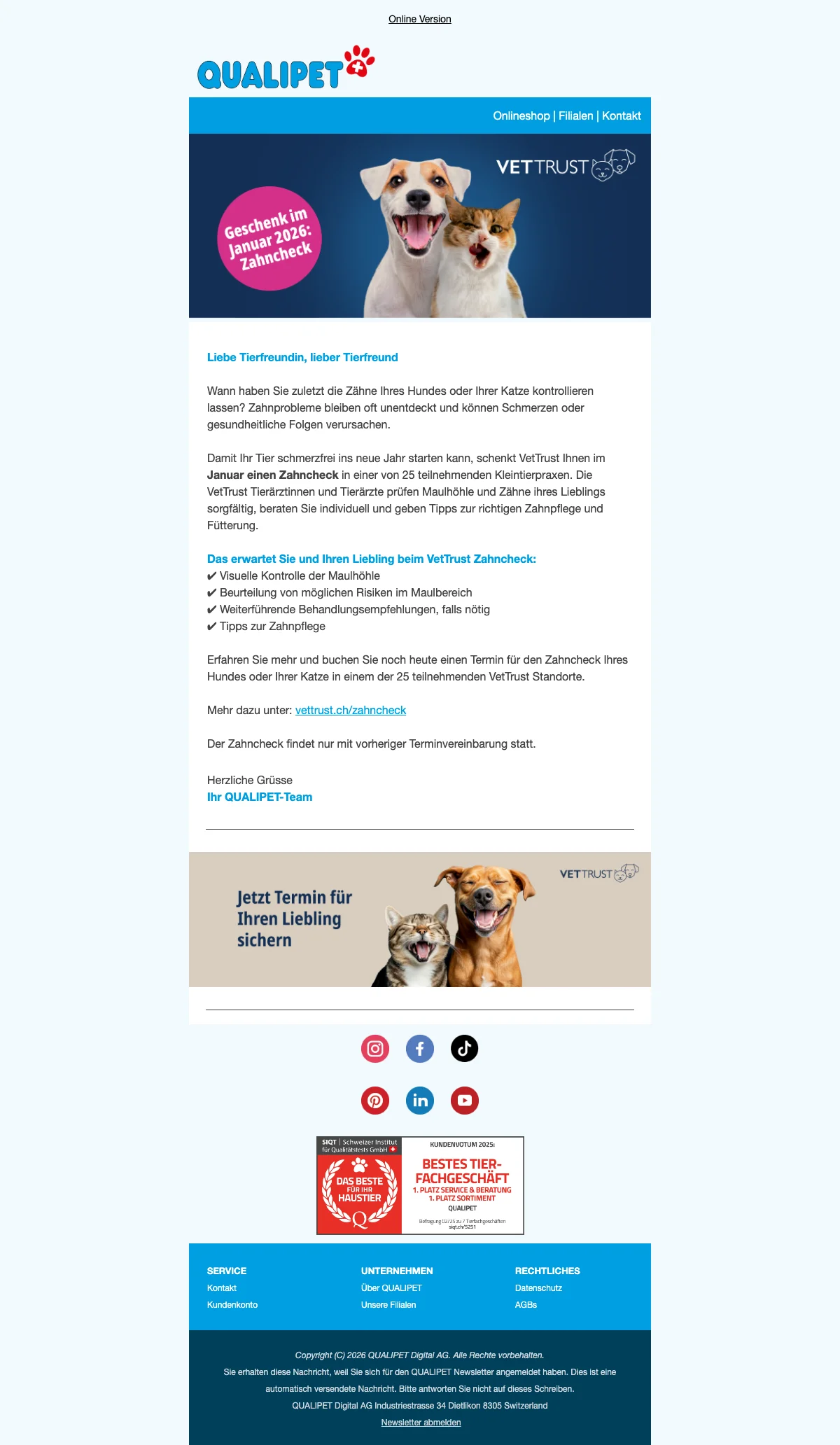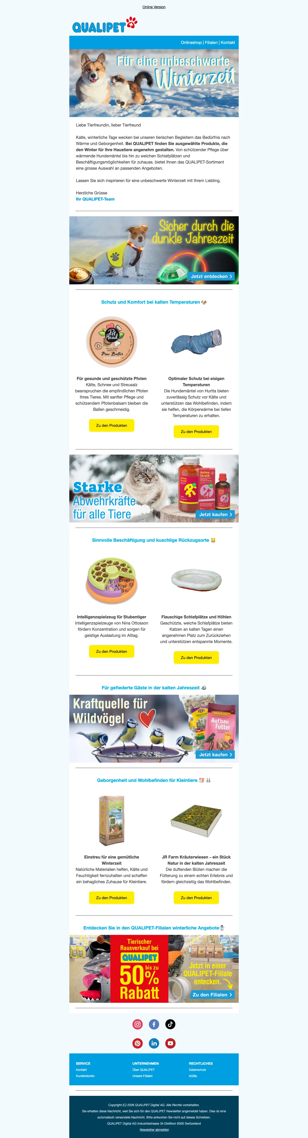 Du bist auf der Suche nach einer besonderen Geschenkidee? Egal ob du in Zürich, Basel, Pratteln oder sonst wo in der Schweiz wohnst: den Onlineshop von Qualipet.ch kannst du von überall aus besuchen. Bestelle einen Gutschein oder hochwertige Tierprodukte und verschenke sie an deine Tierfreunde.
