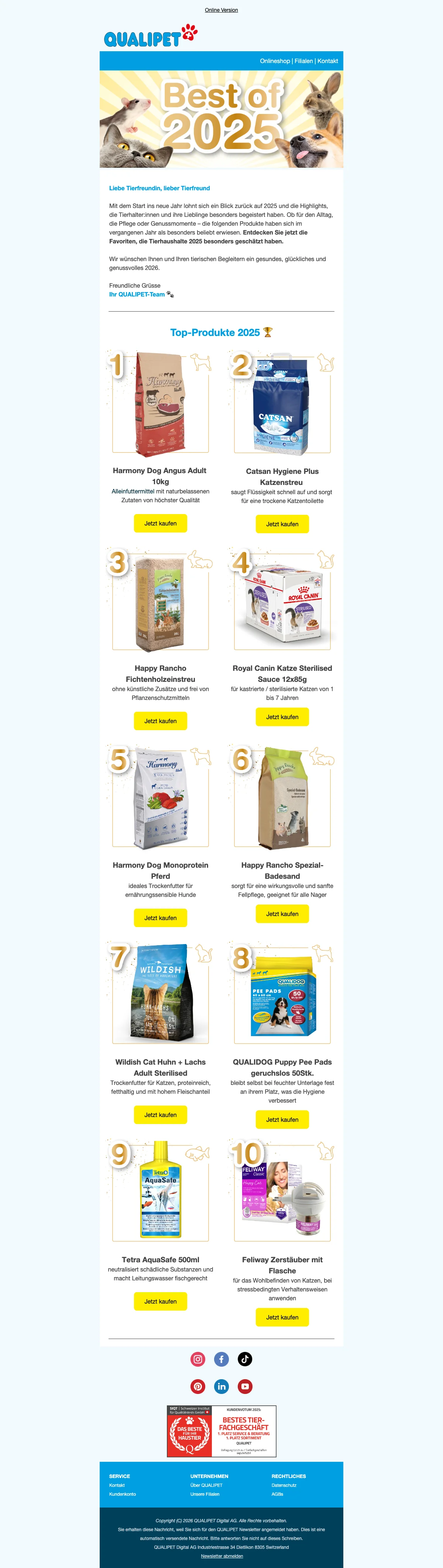 Du willst deinem Tier hochwertige Produkte kaufen, und dennoch Geld sparen? Gratuliere, dann bist du bei Saleduck.ch genau richtig. Besuche uns regelmäßig und sichere dir laufend eine attraktive Aktion, einen Qualipet Gutschein oder Gutscheincode. Zusätzlich warten in der Kategorie "Angebote" im Shop von Qualipet.ch immer wieder lohnenswerte Aktionen auf dich.