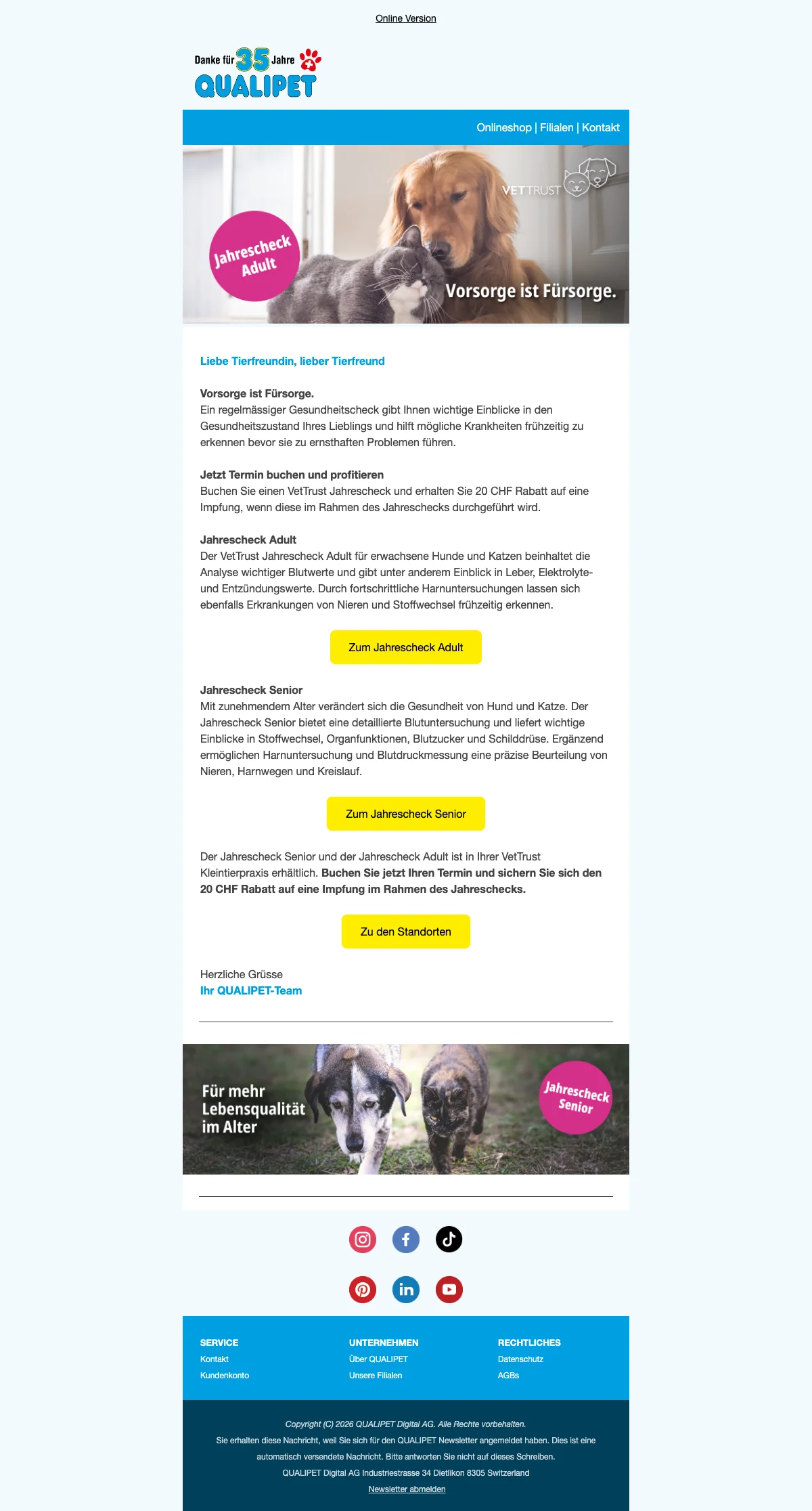 Qualipet ist der grösste spezialisierte Anbieter von Haustierbedarf in der Schweiz. Gegründet wurde das Unternehmen 1982 und begeistert seither nicht nur Tierfreunde, sondern auch Tiere in der ganzen Schweiz. Damals wurden Produkte ausschließlich über Versand durch die Zeitschriften Katzen-Magazin und Hunde-Magazin angeboten. Nachdem sich die Verkäufe jährlich gesteigert hatten, wurde 1991 die Qualipet AG gegründet und in Dietlikon im Kanton Zürich wurde der erste Haustier-Fachmarkt eröffnet. Jahre später zählt Qualipet 38 Filialen, welche zusätzlich durch weitere 27 Filialen aufgrund Übernahmen ergänzt wurden. Freu dich also über 25 Jahre Fachkompetenz der Nr. 1 im Schweizer Zoofachhandel.