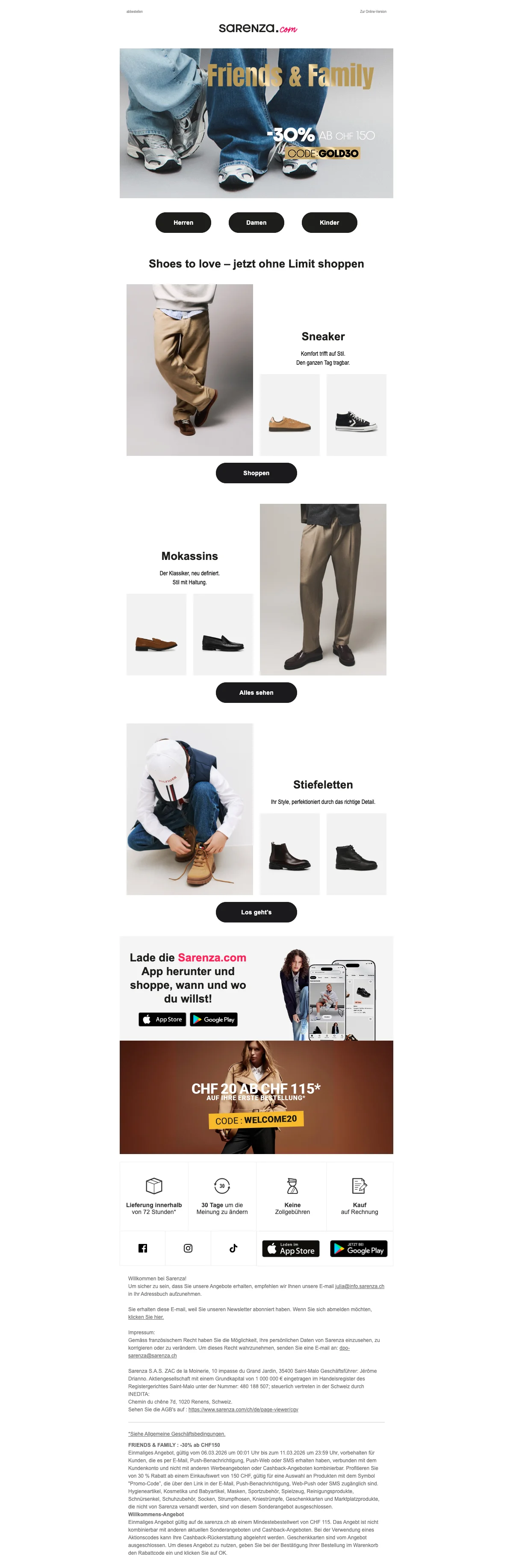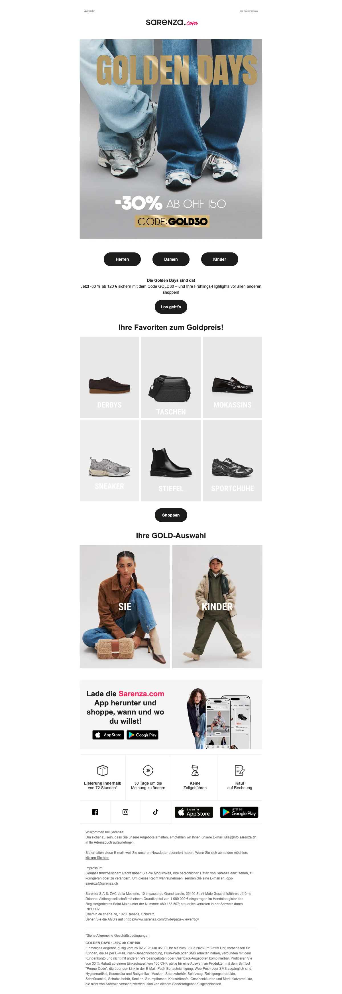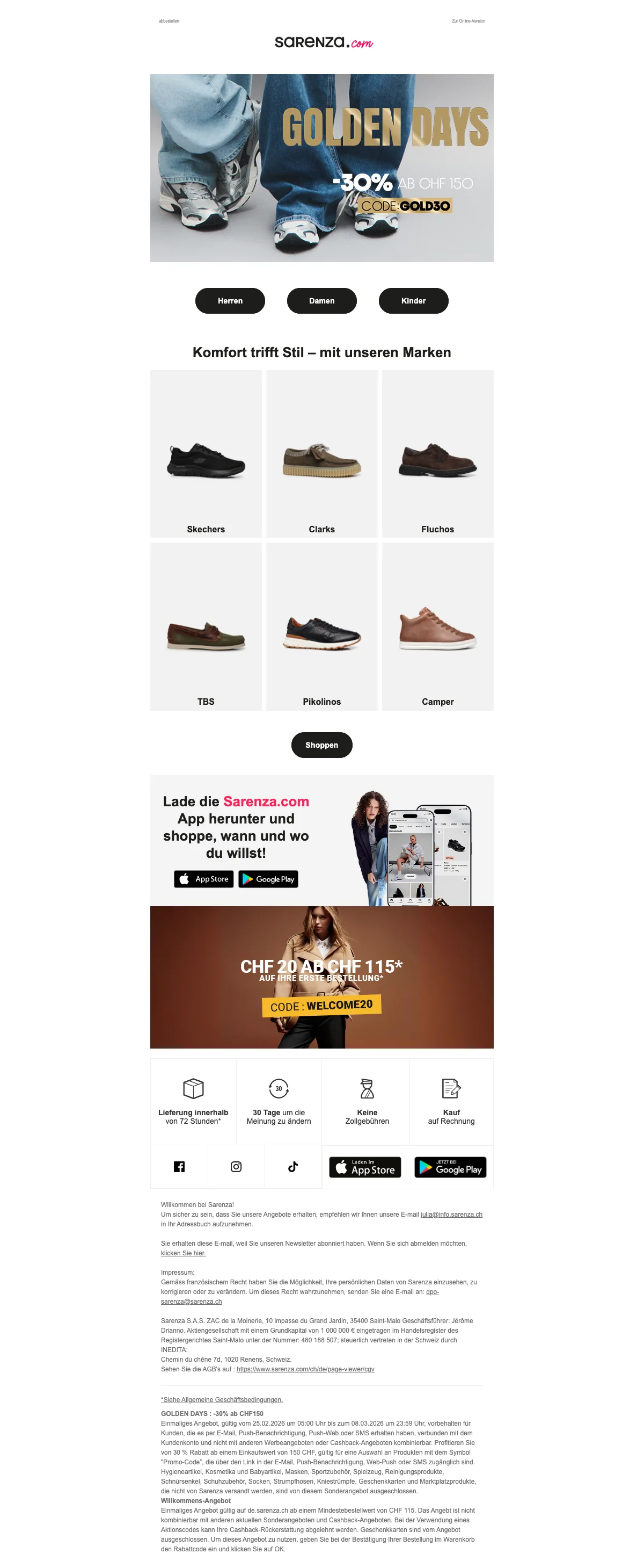 Damit deine Füße im Herbst und im Winter nicht frieren müssen, hat Sarenza die verschiedensten Schuhmodelle für dich im Sortiment. Passend zu den kälteren Jahreszeiten gibt es tolle Stiefel online zu kaufen. Von Cowboystiefeln, bis hin zu Overkneestiefel, gibt es bei Sarenza Schweiz wirklich alles! Eine Frau kann nie genug Schuhe haben, von dieser Aussage sind wir überzeugt. Also hole dir dein neues Paar Lieblingsstiefel und lasse sie dir einfach bequem vor die Haustür liefern. So angenehm kann Einkaufen sein. Kein nerviges Anstehen an der Kasse mehr.